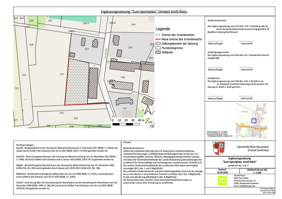 Mit Beschluss Nr. B-0555/2024 beschloss die Gemeindevertretung in ihrer öffentlichen Sitzung am 26.11.2024 die förmliche Beteiligung der Öffentlichkeit und Träger öffentlicher Belange zum Entwurf der Ergänzungssatzung „Zum Sportplatz“ für den Ortsteil Groß Rietz der Gemeinde Rietz-Neuendorf.