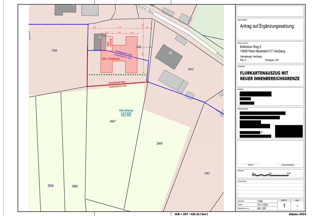 Der Geltungsbereich der künftigen Satzung umfasst einen Teil des Flurstücks 347 in der Flur 2, Gemarkung Herzberg im gleichnamigen Ortsteil der Gemeinde Rietz-Neuendorf. Dieses Teilstück befindet sich im Außenbereich (§ 35 BauGB) und wäre damit für die geplante Bebauung mit einem Einfamilienhaus samt Einliegerwohnung für ein Familienmitglied der Bauherrenfamilie nicht zugänglich. Wie sich aus dem vorliegenden Flurkartenauszug des Planers ergibt, liegt dieser kleinere Teil des geplanten Baufeldes zum gegenwärtigen Zeitpunkt nicht innerhalb der in Herzberg geltenden Klarstellungs- und Abrundungssatzung aus dem Jahr 1999.
