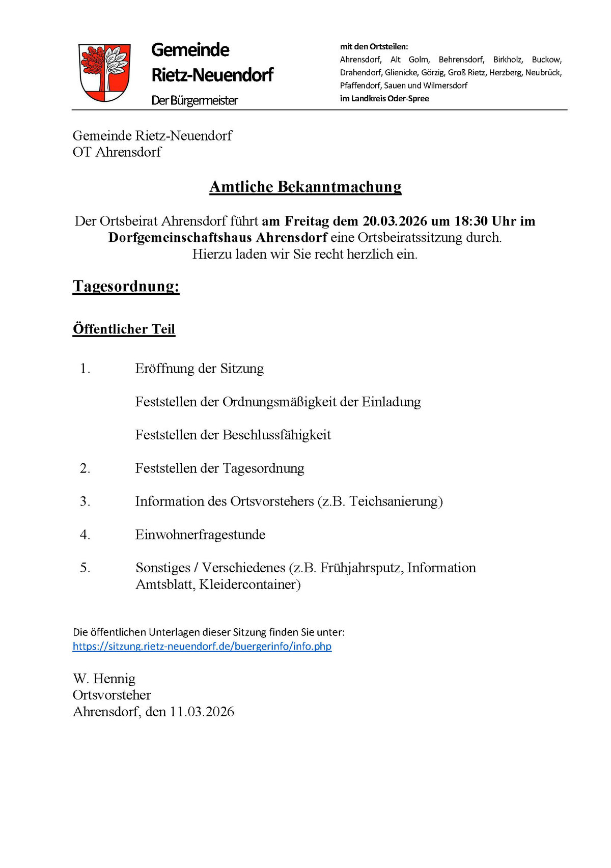 der Ortsbeirat Ahrensdorf lädt am 20. März 2026 zur Ortsbeiratssitzung ein